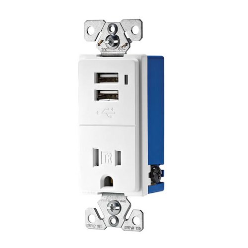 Cooper's USB Charger and Tamper Resistant Receptacle offers convenience and safety all in one device! It features 2 USB charging ports and a Tamper Resistant Receptacle. The Cooper Wiring Devices Combination USB Charger with Tamper Resistant Receptacle quickly and easily provides consumers with the ability to charge their electronic devices directly from a standard outlet without bulky adapters that can be lost or misplaced. Additionally, they contain UL approved Tamper Resistant Shutters for child safety and to ensure compliance with the 2011 NEC Article 406.12 that requires all 125V receptacles in dwelling units to be Tamper Resistant.