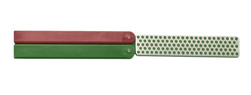 DIAMOND DOUBLE SIDED SHARPENER *9-1/2" open, 5" closed *Polycarbonate base *Dot pattern keeps diamond surface clean *Color coded handle folds to protect stones