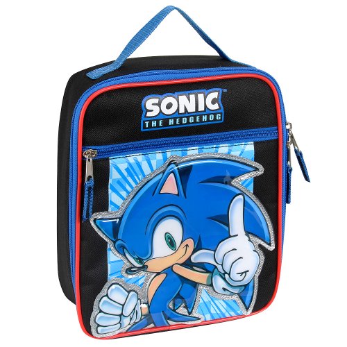 Rev up your lunch break with this Sonic the Hedgehog Sonic Power Lunch Tote! It features a zip-around design for quick access and a handle for easy carrying. The interior is fully insulated to keep food fresh, while the exterior boasts a super-cool image of the iconic blue hedgehog. The Sonic the Hedgehog Sonic Power Insulated Lunch Tote - Black and Blue features: Includes 1 lunch bag Zip-around design with one carry handle Use it to take a healthy lunch to school Made from durable fabric Black and blue tote features a puffy, silver-outlined image of Sonic Fully insulated main compartment with exterior insulated zip pocket Dimensions: 9.5 x 8 x 3 inches