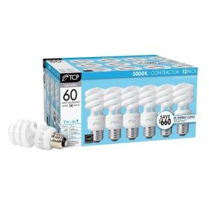 The TCP 14-Watt (60W) Daylight CFL Light Bulbs (12-Pack) (E)* are an energy-efficient solution for your lighting applications. Featuring a spiral shape with a medium base, these bulbs emit 800 lumens over up to 10,000 hours, making them a great choice for demanding lighting projects. (E)* means these bulbs meet Federal minimum efficiency standards. Non Dimmable.